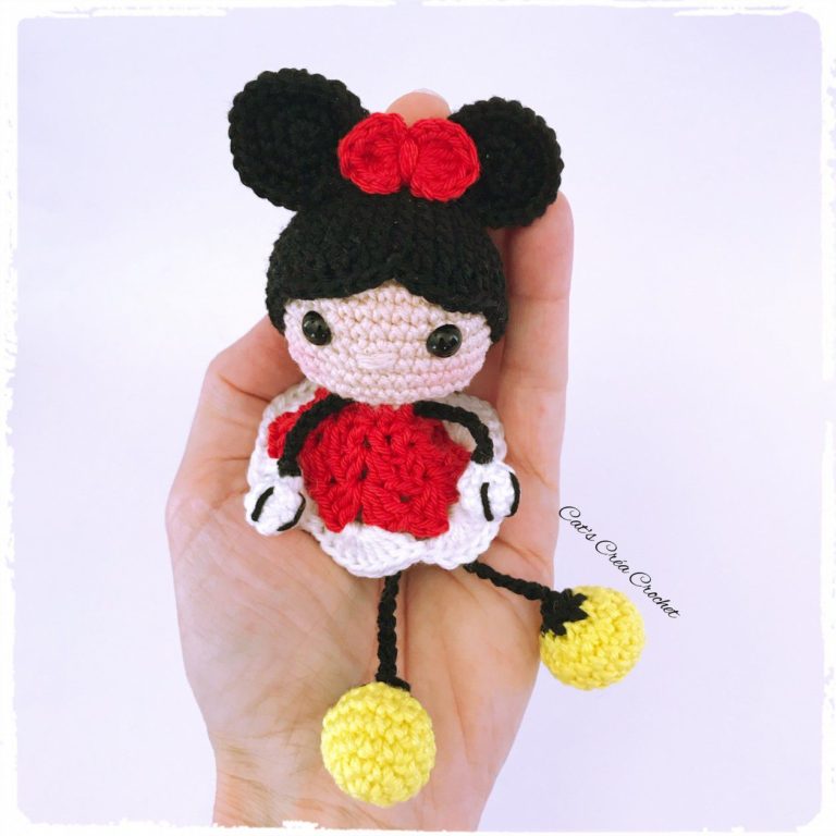 Em um circulo magico, (2 corr, 5 pa, 2 corr, pb) x2, puxe o fio, deixe um fio longo e passe pelo