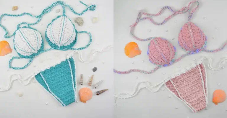 Dessa forma, prenda os bojos do biquíni com pontinhos à mão nas peças de crochê. E assim para os cordões, use 2 fios brancos e 3 verdes juntos, faça 160 cm de corr (1 vez) e 55 cm (2 vezes). Assim, entrelace o cordão maior na base e prenda os 2 menores na parte superior do Top.