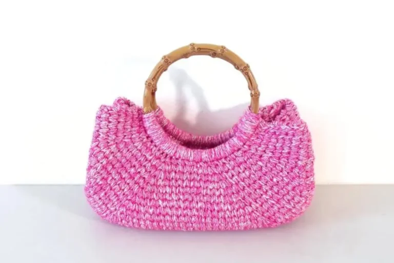 - R1 (RS): Ponto deslizante unido, p. desl. na laçada de trás em cada ponto seguinte, p. desl. na 1ª corrente de base de onde a alça está presa, p. desl. envolvendo a alça no meio, corte deixando caudas longas e passe o fio pela última laçada. Enfie a agulha de tapeçaria e volte para a direita envolvendo o fio duas vezes na parte de trás de cada ponto seguinte, até alcançar a junção de p. desl. na costura lateral da bolsa. Arremate e esconda todas as pontas.