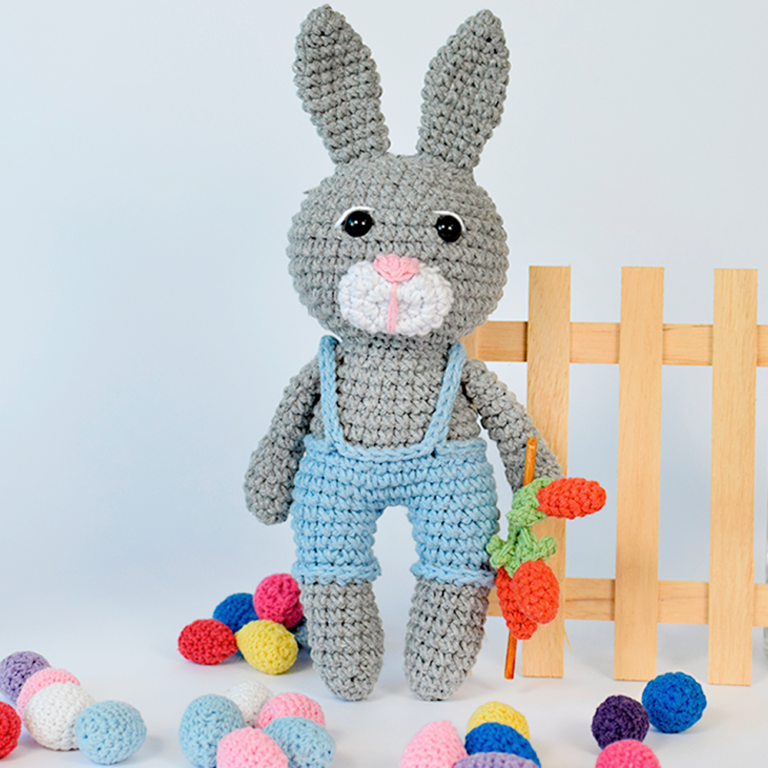 1 – Vire o Coelho José de cabeça para baixo e prenda o fio 1pb. antes do ultimo, na alça da frente que não foi trabalhada na carr. 11. e faça 1pb. sobre cada pb. 12x. = 12pb.