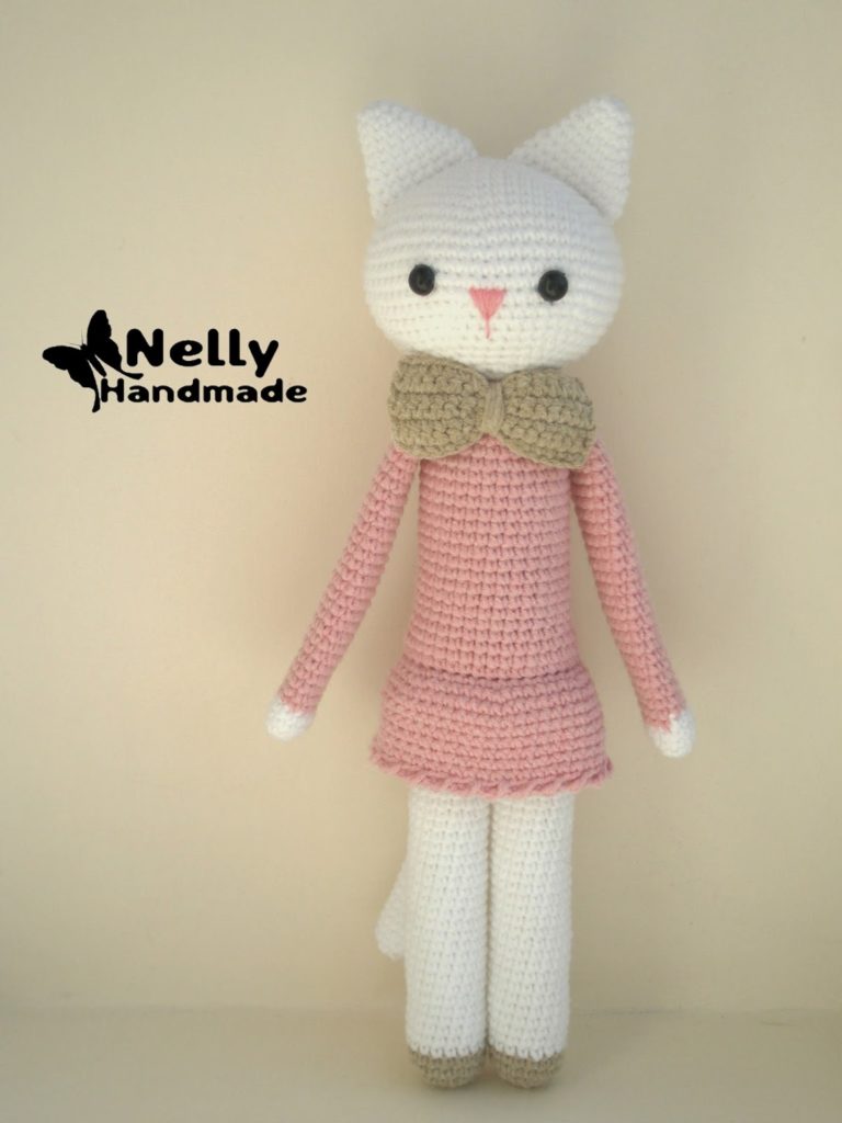 1. Vire a gata de cabeça para baixo, e junte o fio rosa nas alças soltas da carreira 6 do corpo. Faça uma carreira de pb