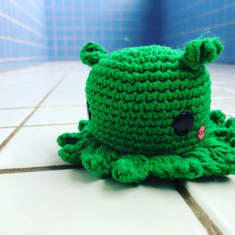 [3 corr, pule 2 pontos e faça pbx no próximo ponto] por toda a volta. Isso irá criar argolas (ou espaços) por toda a volta que vamos usar para criar os tentáculos.