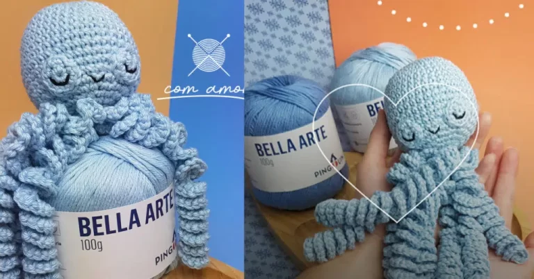 Então ao terminar de preencher todas correntes, fazer ponto baixíssimo na cabeça e seguir com o processo novamente. o Pbx ,arrematar e costurar para fazer acabamento. obg.: Arrematar com certo comprimento de fio para costurar o vão entre os tentáculos. feito com bella arte