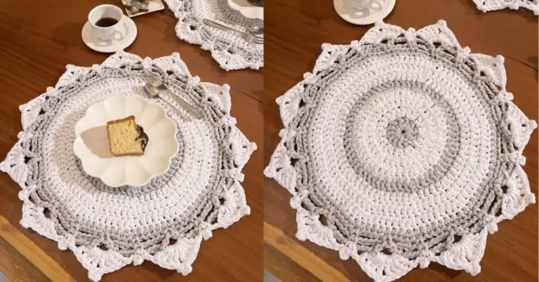 Primeiramente, siga o gráfico do sousplat com o fio Cinza, inicie com um anel mágico. Então, na 1ª carr.: inicie com 3 corr. dentro do anel trab11 p.a feche com p.b.x. rem. o fio. Ademais, na 2ª carr.: emende o fio Branco, inicie com 3 corr. 1 p.a. no mesmo p. de base, * 2 p.a. no mesmo p. de base, * rep. de *a* mais (10x). Assim, feche o sousplat com p.b.x.
