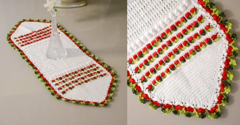 Ademais, na 4ª carr: prenda o Premium verde no mesmo lado onde iniciou a última carr branca, trabalhe 1 p.b. no 1º p.b., 2 corr, *no espaço seguinte faça [(2 p.a. tirados juntos, 1 corr) 3 vezes]*. Repita de * a * e no final da carr corte e arremate o fio no trilho de mesa .