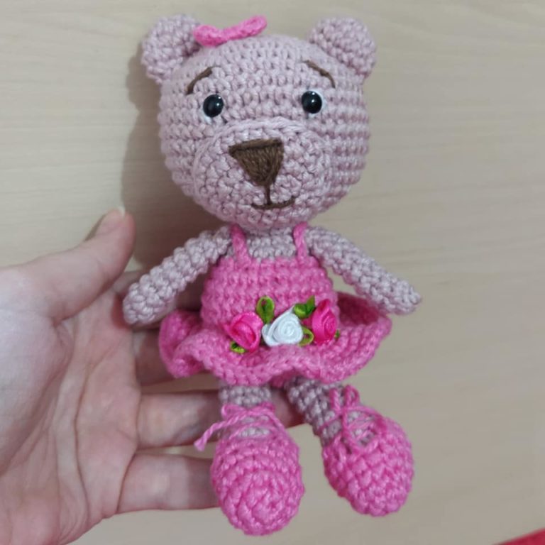 Com um pedaço de fio passe com uma agulha nas pontas, trance e amarre no pezinho da nossa ursinha