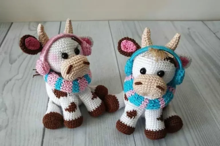 - Fio ALIZE FOREVER (100% microfibra acrílica, 50 g / 300 m). Cores: branco (principal), marrom, bege para o focinho e chifres, e um pouco de rosa.
